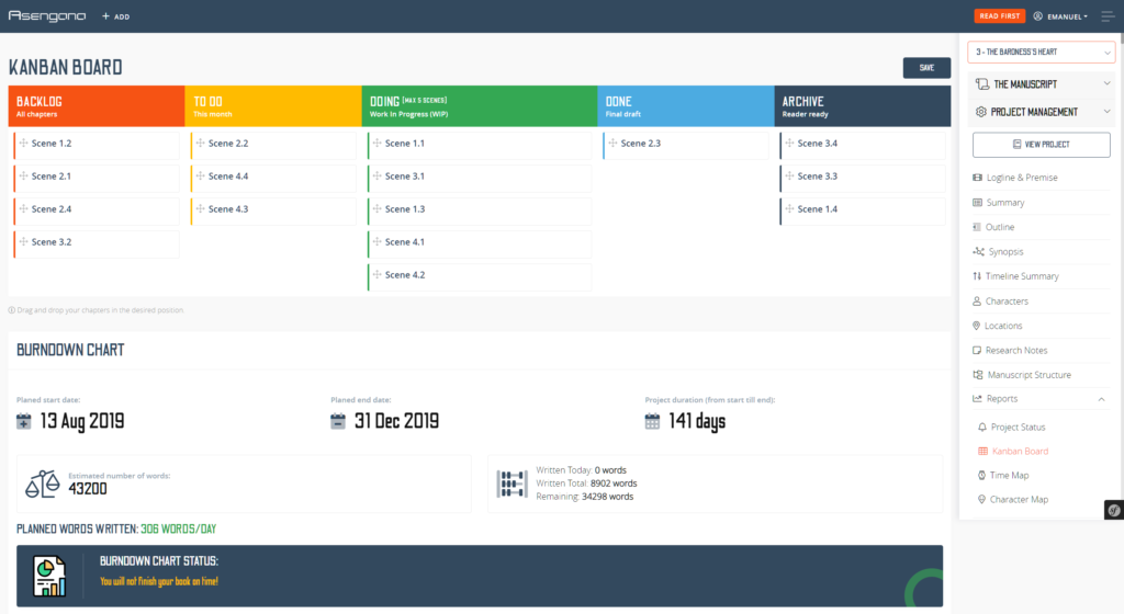 As for writing, you will have to use Asengana to understand how we adapted Kanban so that one can better organize your writing projects. You’ll discover a tool that increases your productivity and offers you valuable insights into your writing process.